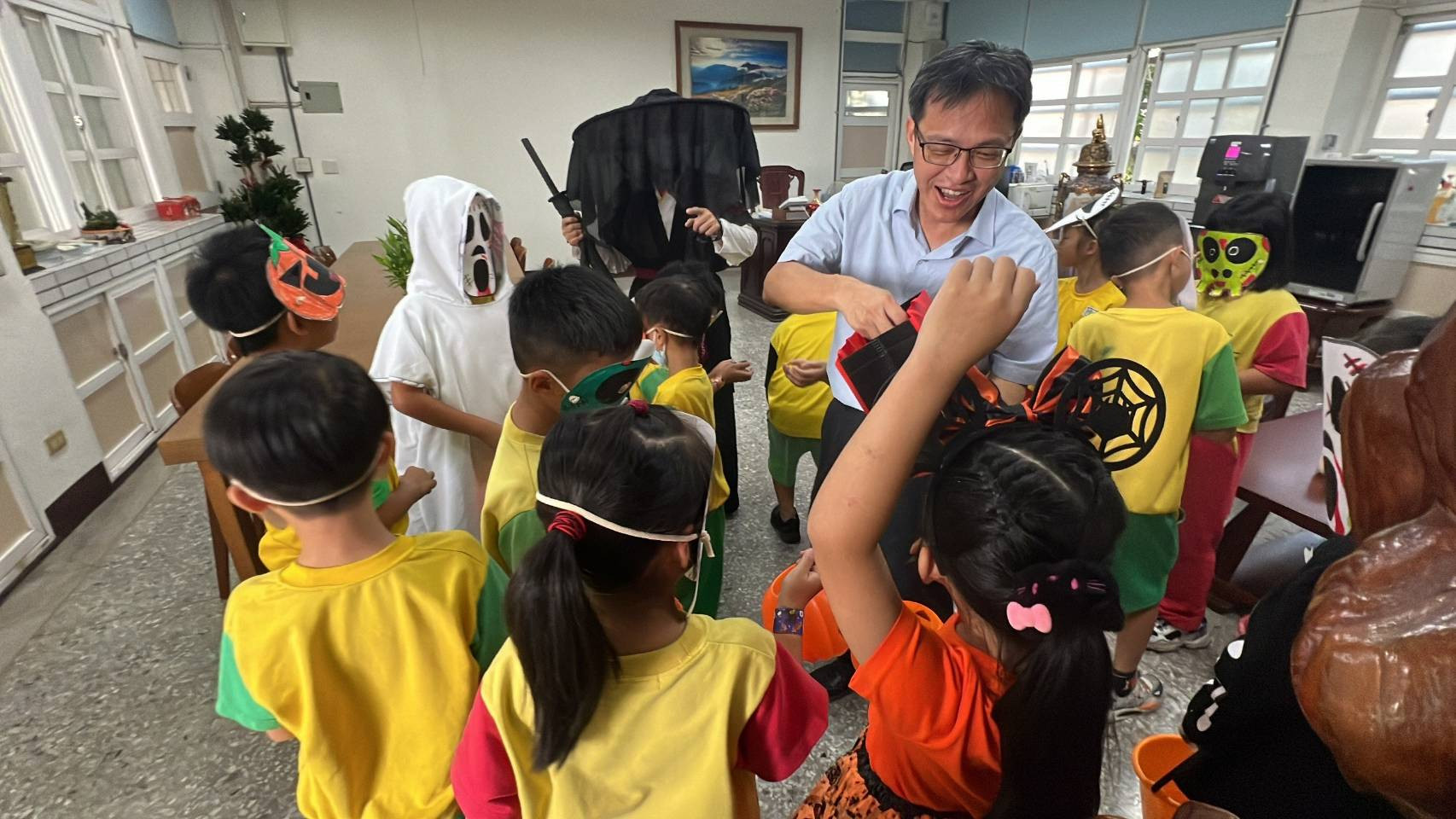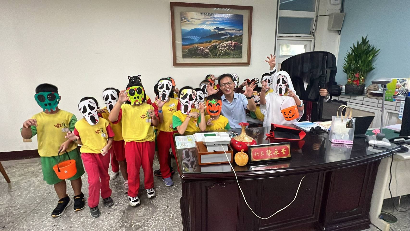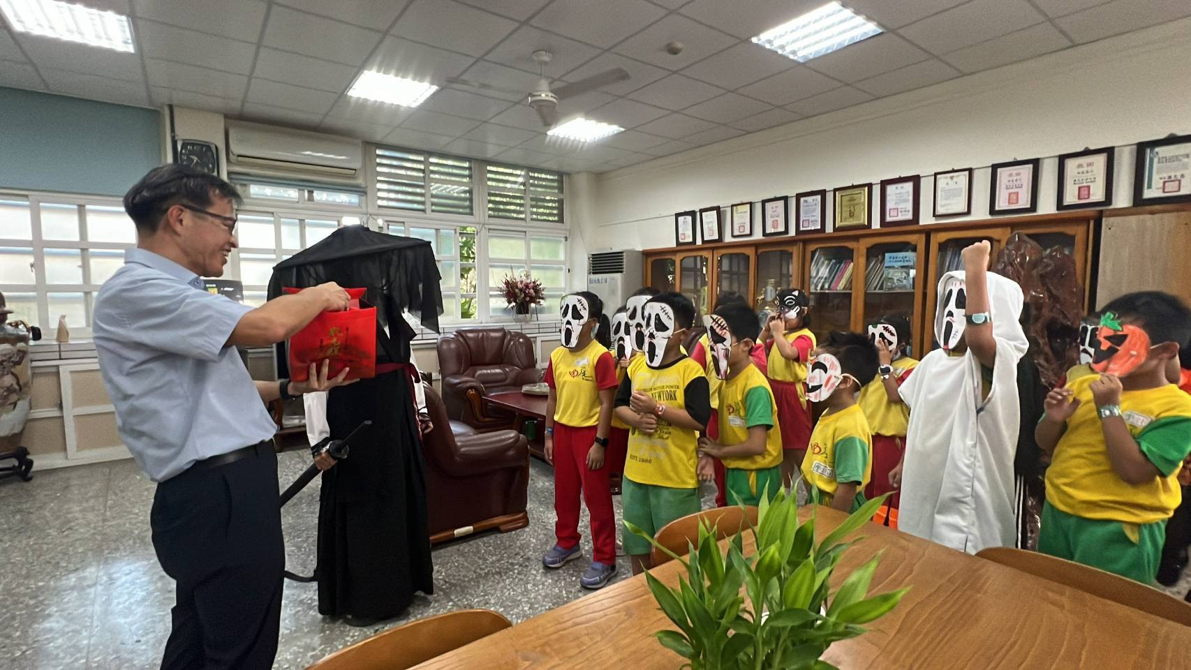 小朋友們穿著萬聖節服裝,成群結隊地來到校長室,對校長說「不給糖就搗蛋!校長準備一些小驚喜,分發給孩子們,讓學生體驗了一個開開心心的萬聖節活動。
