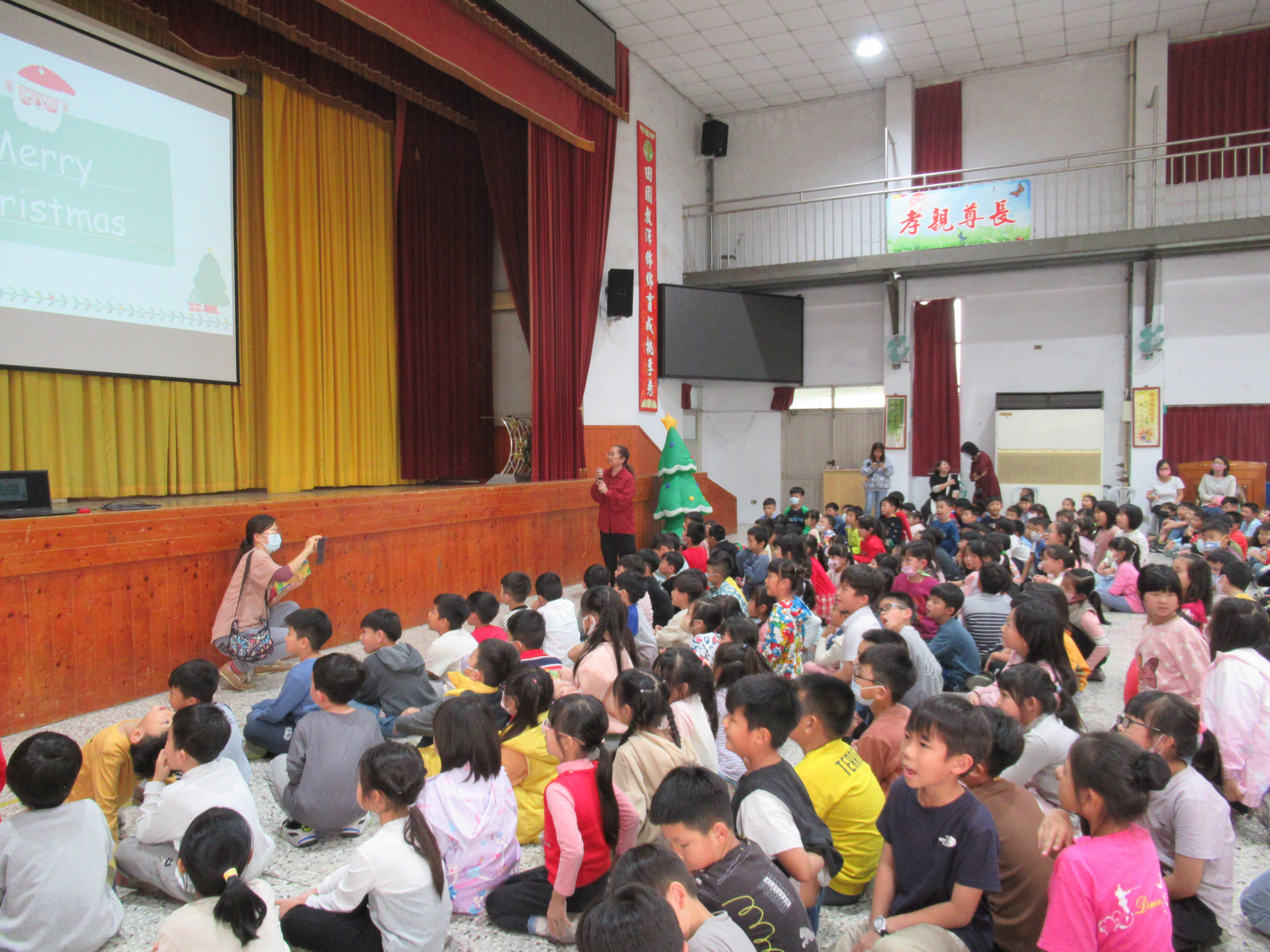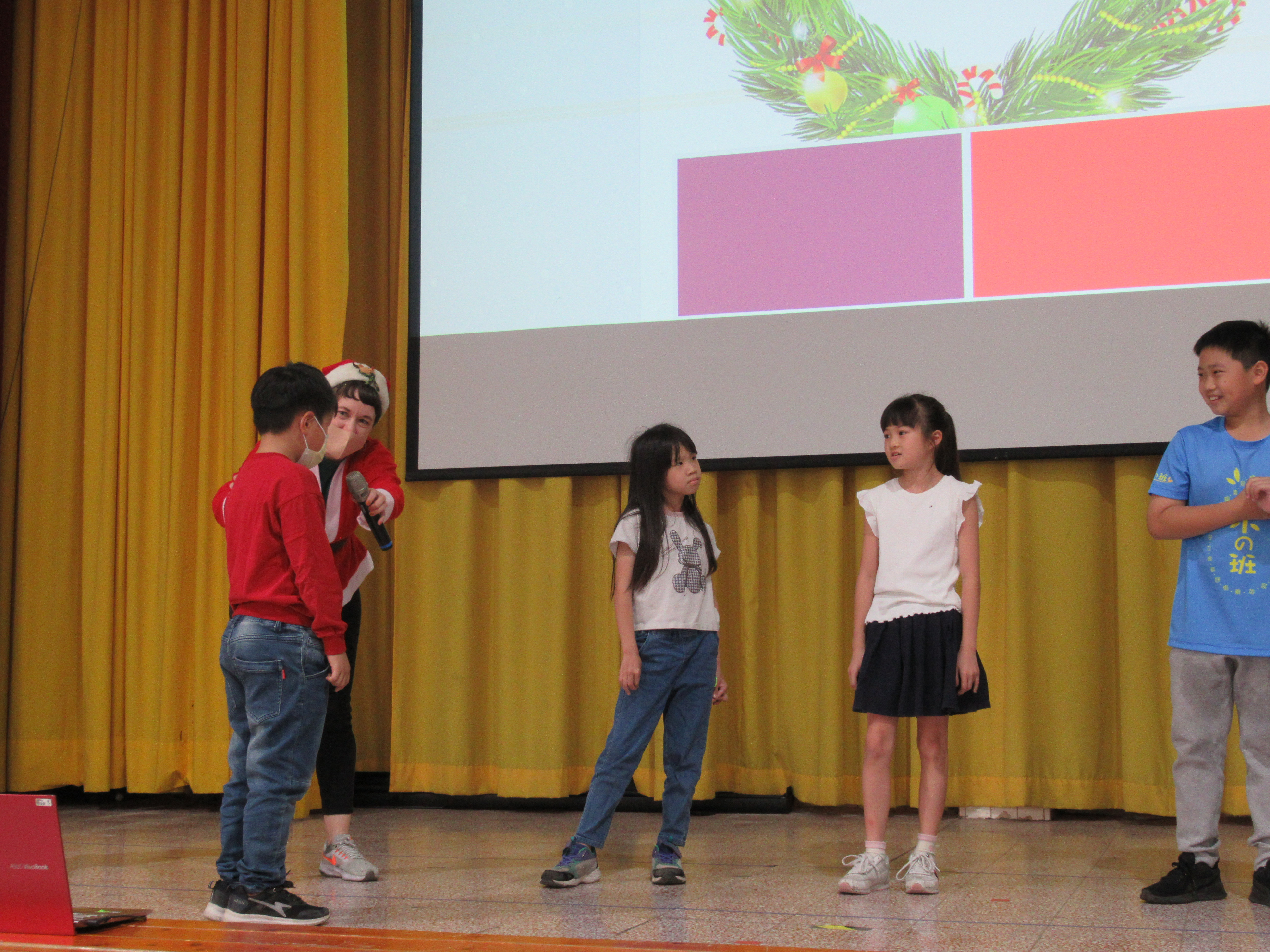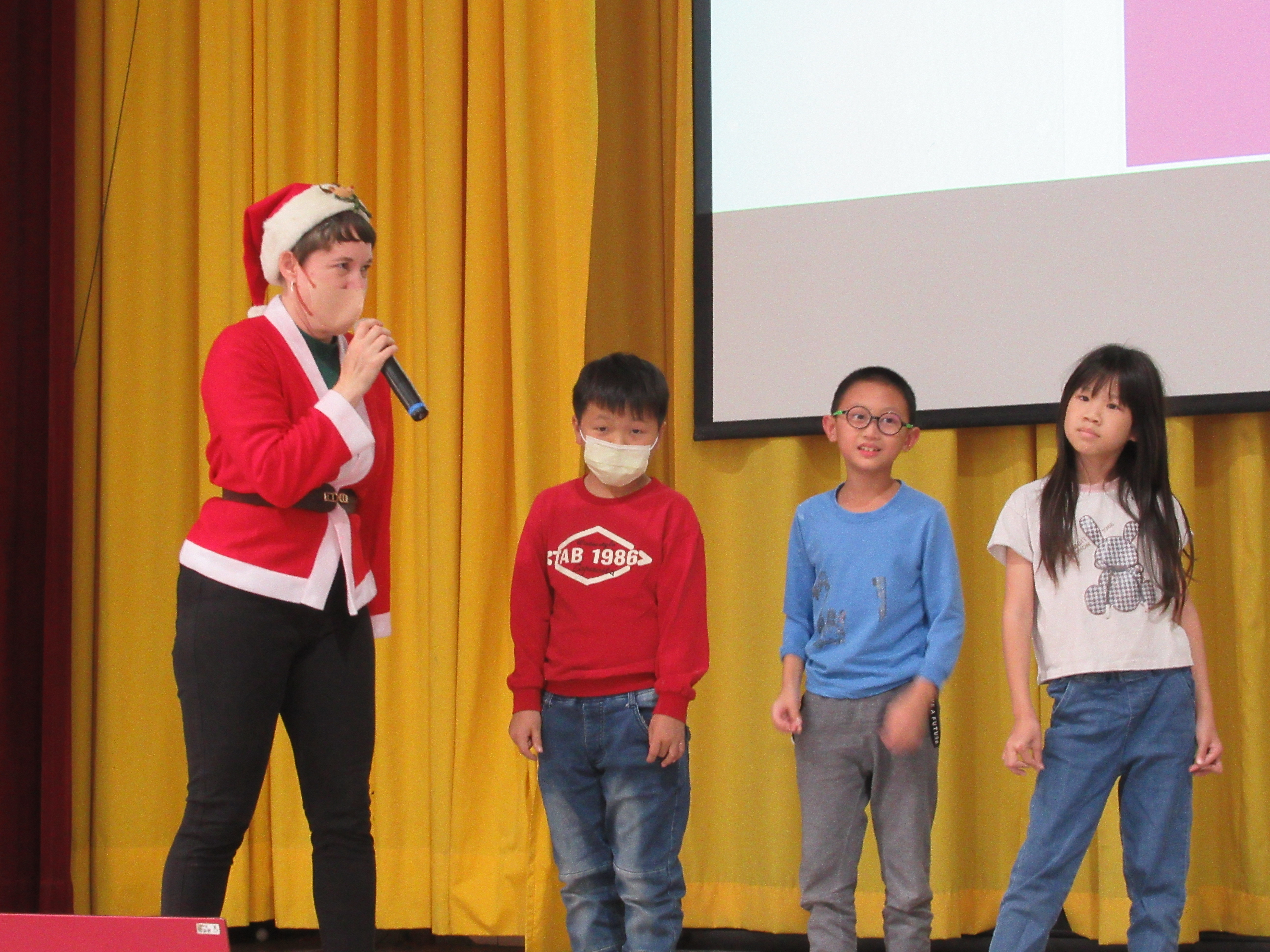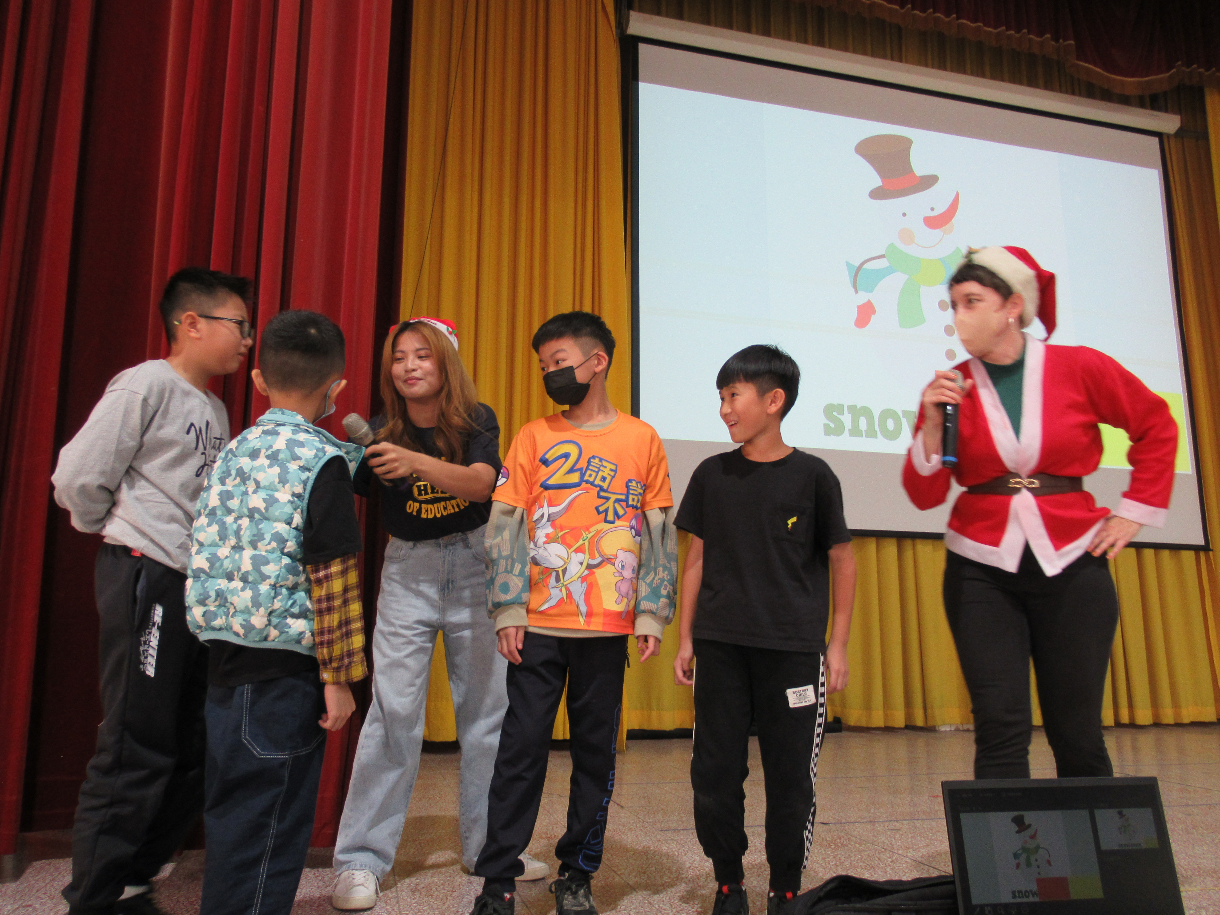 教師們敘述聖誕節繪本故事,搭配投影布景,開啟聖誕歡樂氣氛。單字教學及有獎徵答,讓全體學生展現高度熱情。當主持人提出問題,幾乎同一時間,數十隻手高高舉起,現場瞬間響起熱烈的聲音:「我知道!我知道!」。最後的聖誕歌舞蹈唱跳,全體學生在歡樂中體驗聖誕的文化與精神!