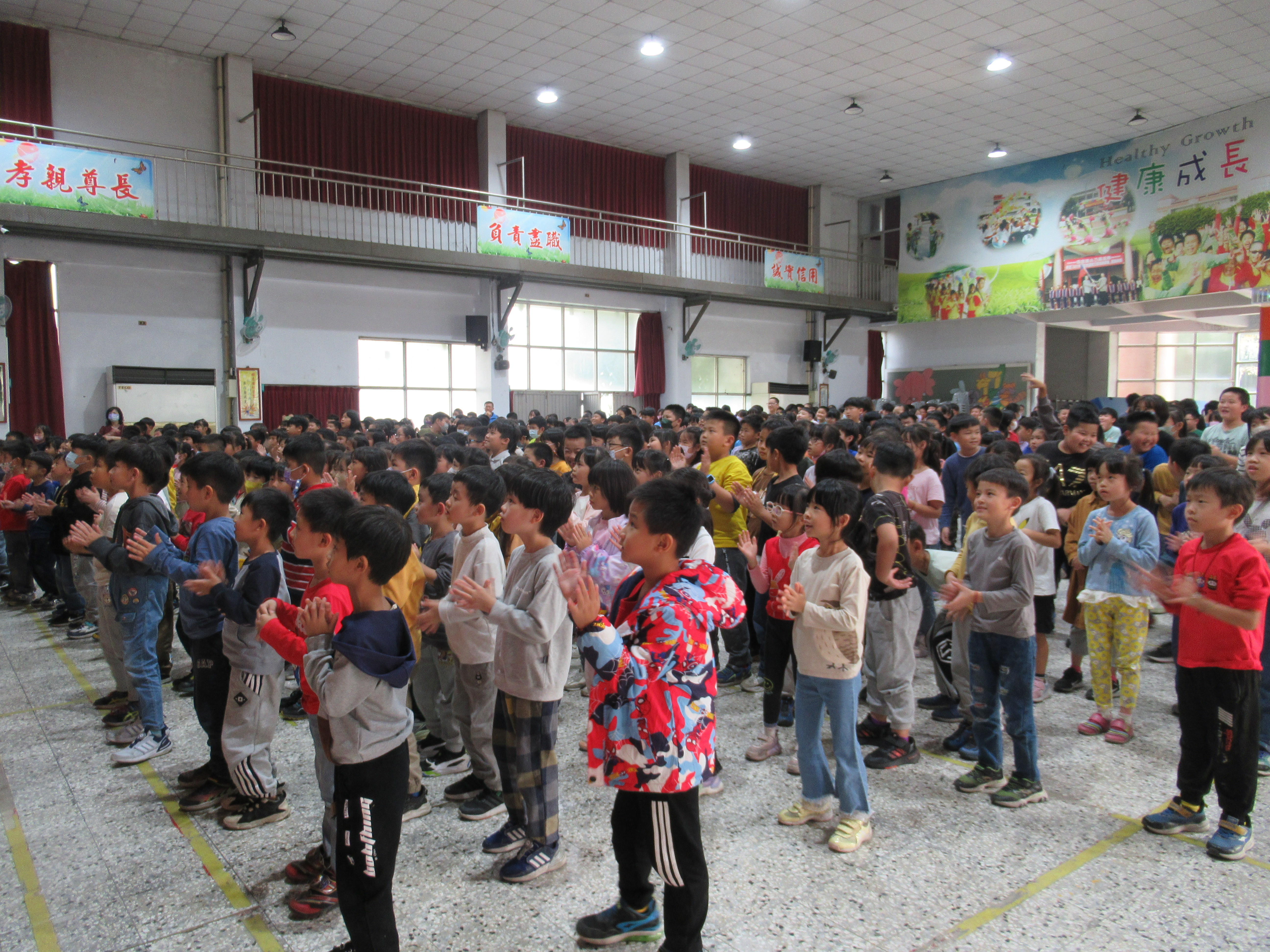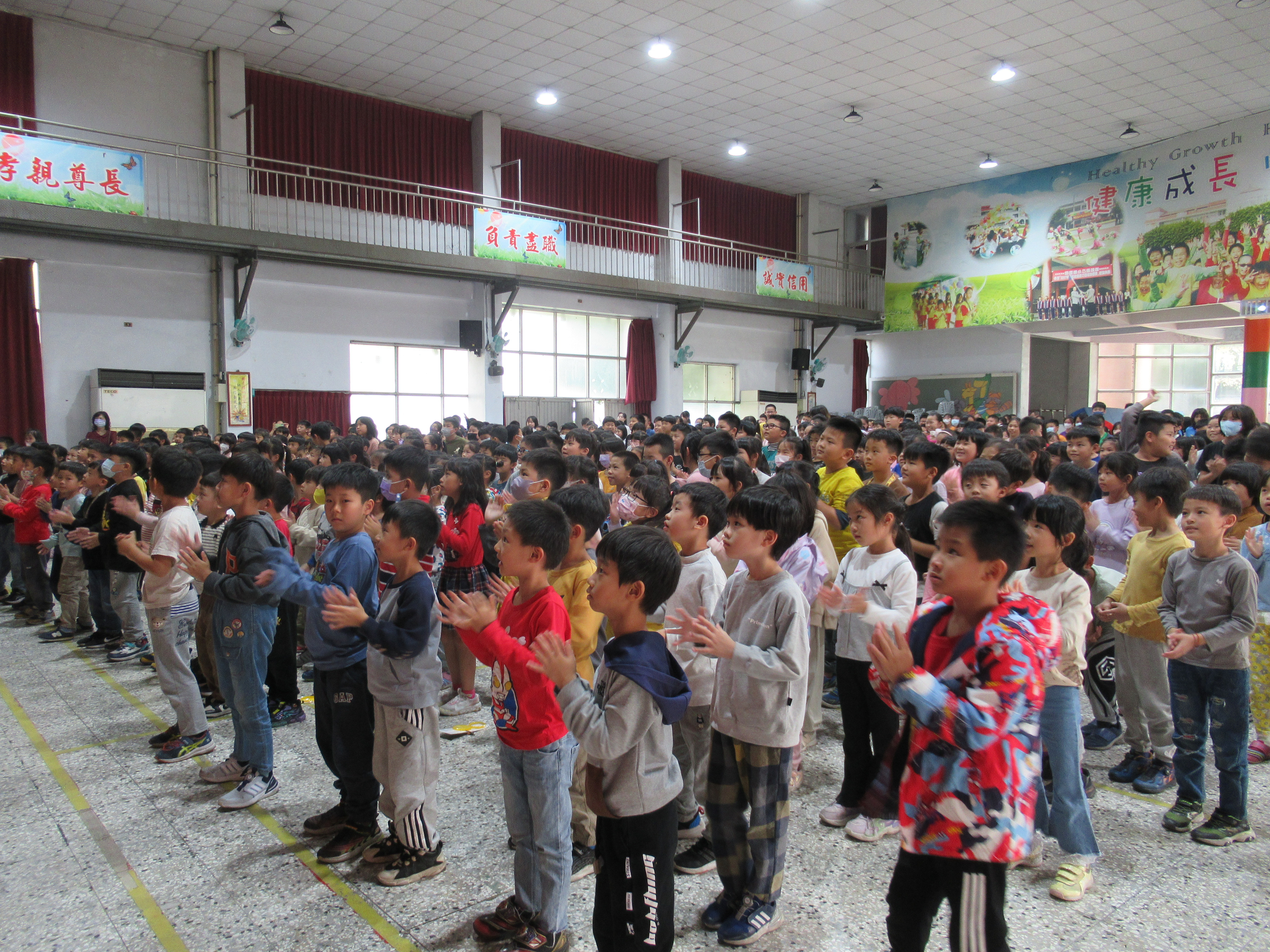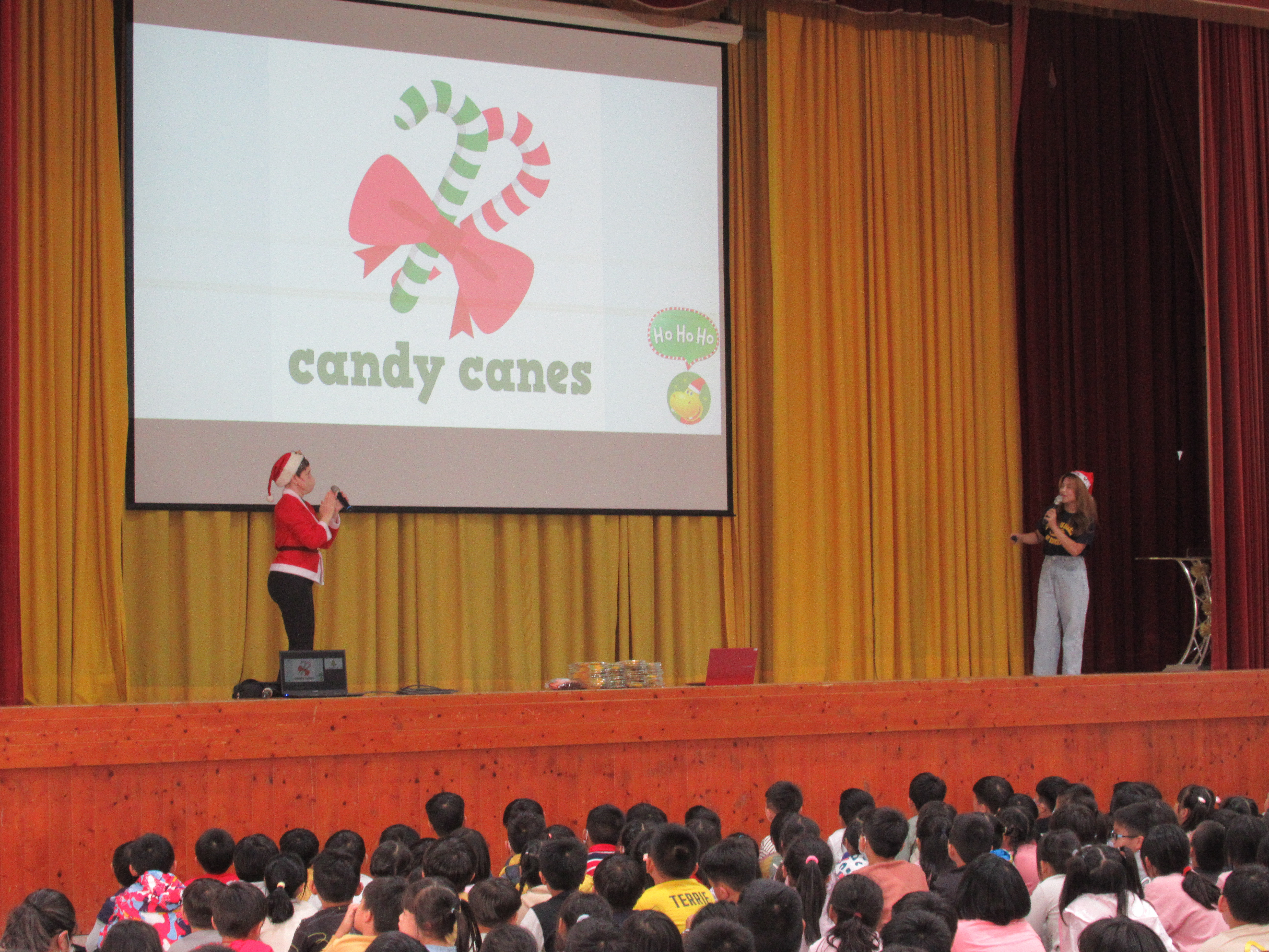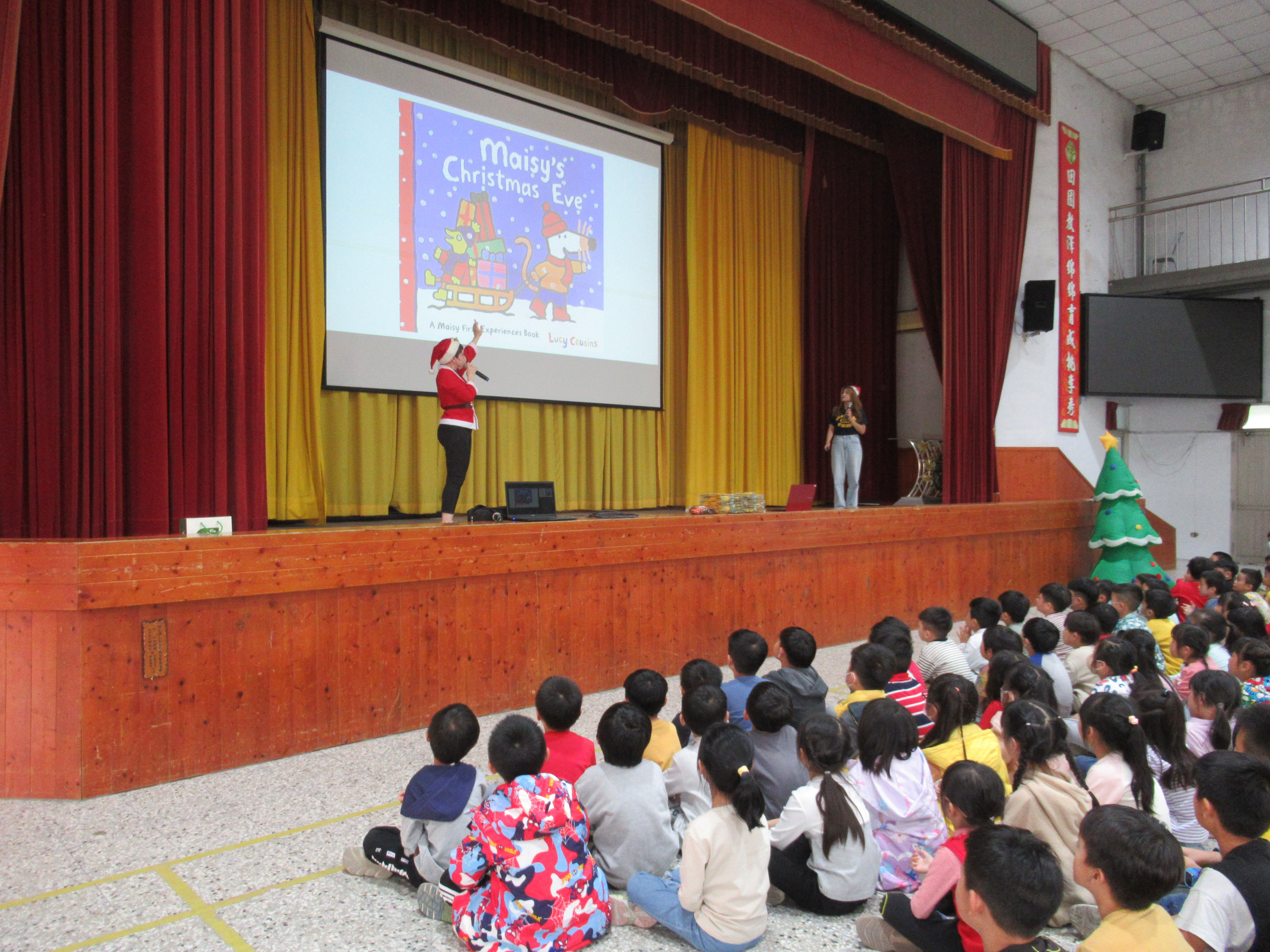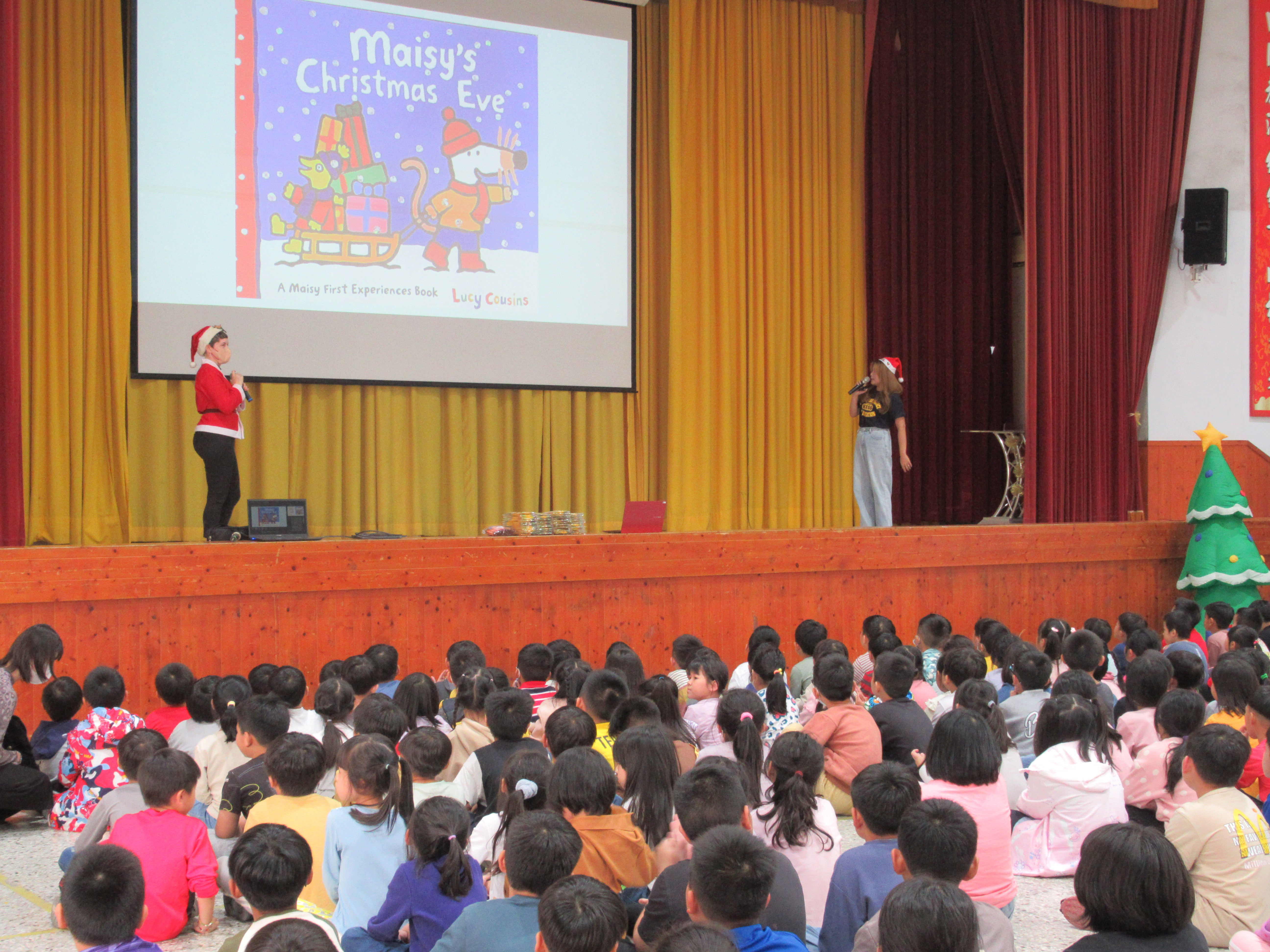 教師們敘述聖誕節繪本故事,搭配投影布景,開啟聖誕歡樂氣氛。單字教學及有獎徵答,讓全體學生展現高度熱情。當主持人提出問題,幾乎同一時間,數十隻手高高舉起,現場瞬間響起熱烈的聲音:「我知道!我知道!」。最後的聖誕歌舞蹈唱跳,全體學生在歡樂中體驗聖誕的文化與精神!