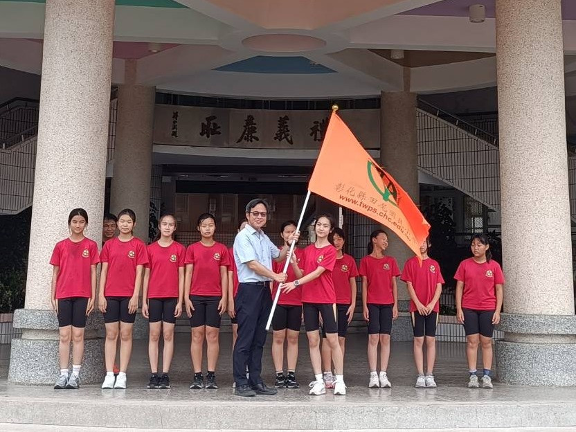 為了鼓勵選手,今天特別邀請校長為巧固球隊頒授「田尾國小校旗」,象徵全校的祝福與支持!